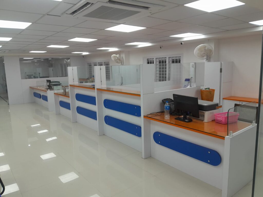 For example, teller counter installation followed defined measurement protocols to ensure ergonomic alignment. Electrical load balancing was verified before final fitting. Glass partitions were installed with visibility and surveillance logic in mind. Lighting placement was checked for glare and uniformity across branches.